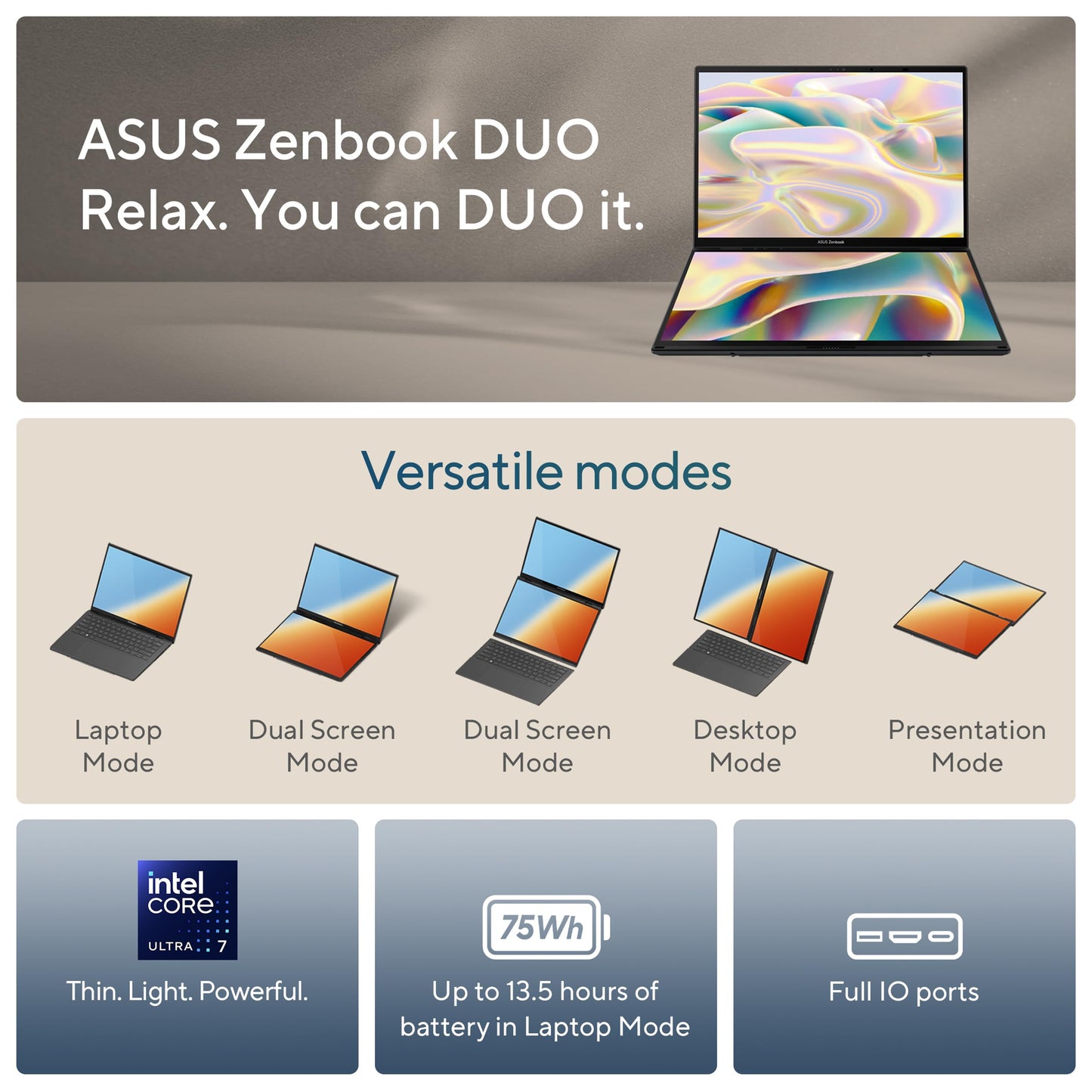 Introducing the ASUS Zenbook Duo Laptop, a revolutionary dual-screen laptop designed for those who thrive on multitasking and creativity. Featuring two stunning 14-inch OLED touchscreens, this laptop allows you to seamlessly manage multiple applications, enhancing your productivity like never before. Perfect for professionals, content creators, and tech enthusiasts, the Zenbook Duo elevates your workflow and creativity, making it a must-have for modern needs.