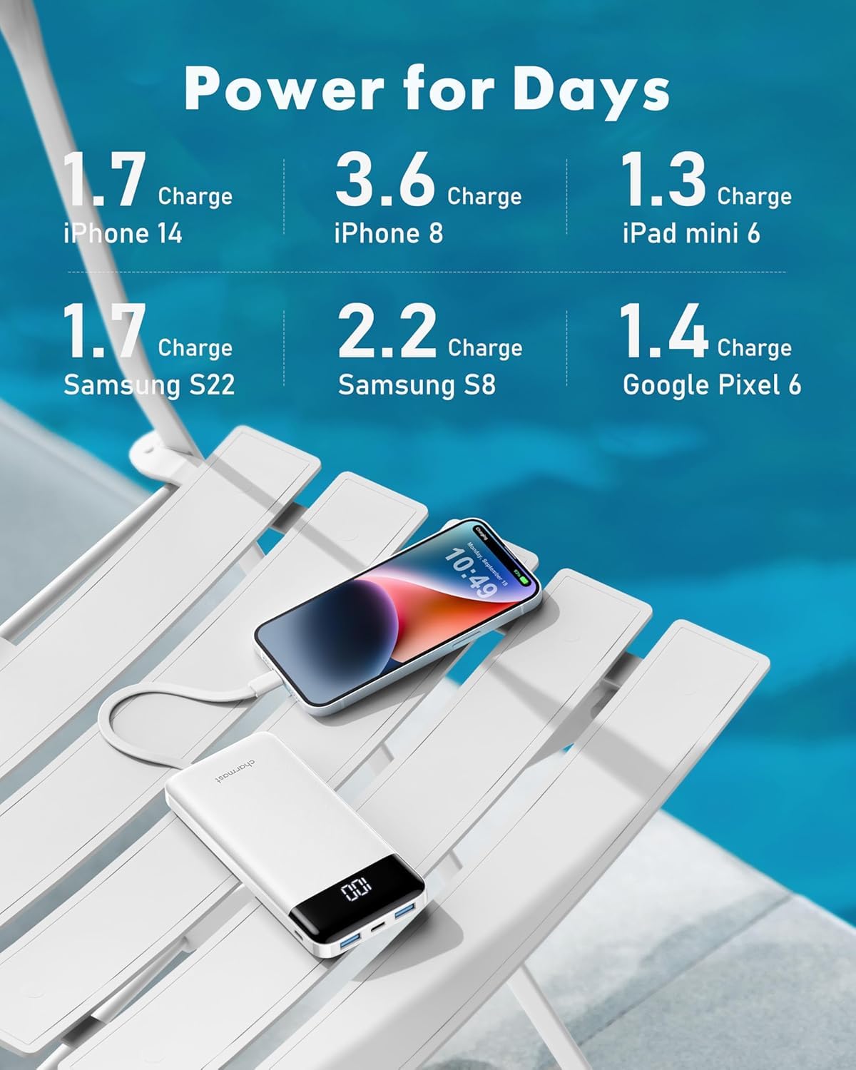 - Built-in Cables: Four integrated cables (Lightning for older iPhones, USB-C, Micro-USB, and a USB input cable) eliminate cable clutter and streamline charging.