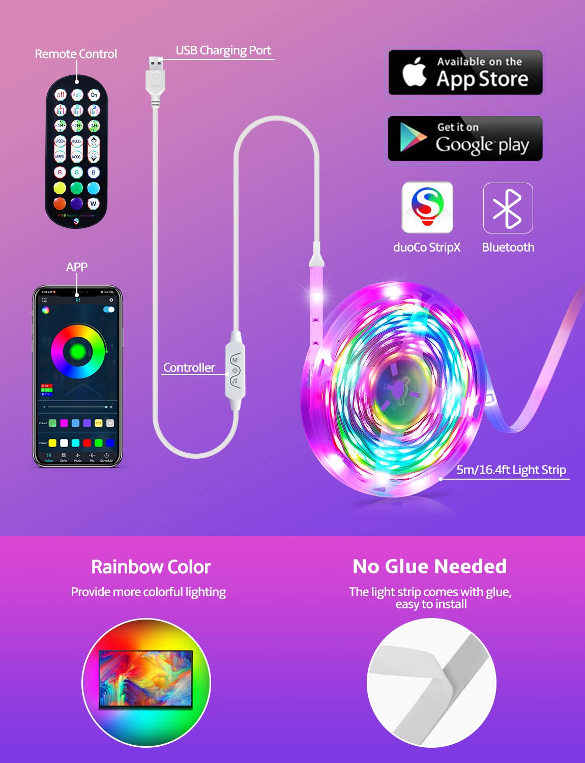 • App Control (Bluetooth): Connect via the free "duoCo Strip" app (iOS/Android) for color selection, scene modes, timing and mic mode.