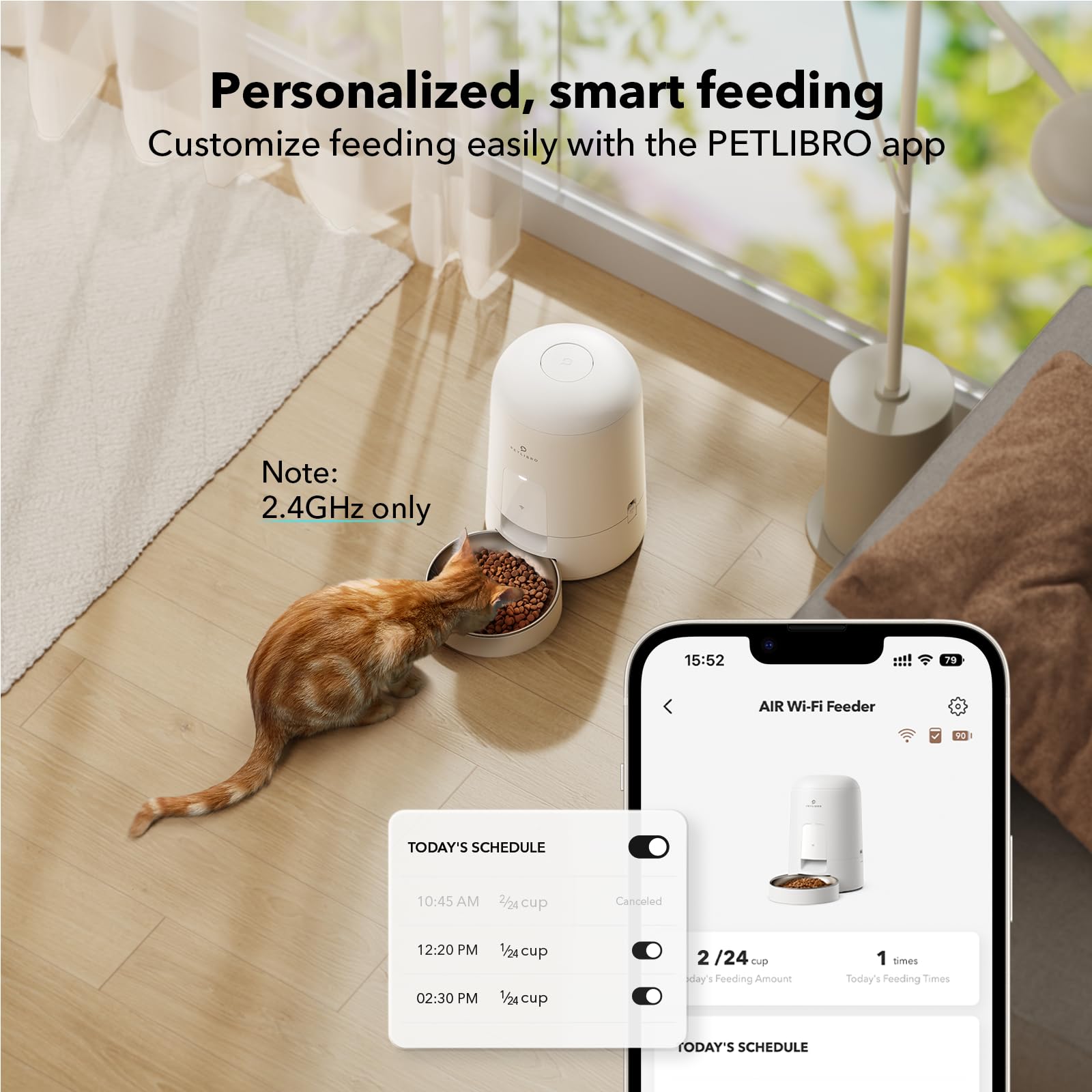 • Wi-Fi Connectivity: Control feeding times and portions remotely through your smartphone, ensuring your pet's dietary needs are met even when you're not at home.
