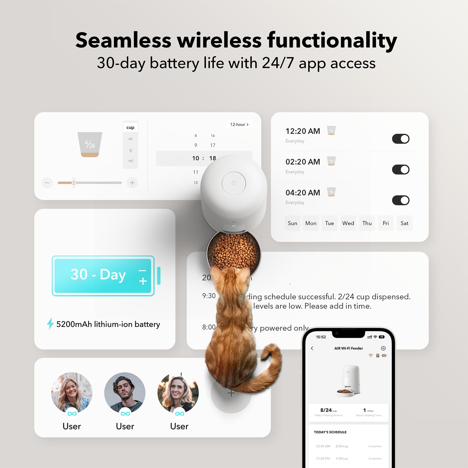 • Voice Recording Feature: Record a custom message to call your cat for mealtime, making feeding feel personal and reassuring.