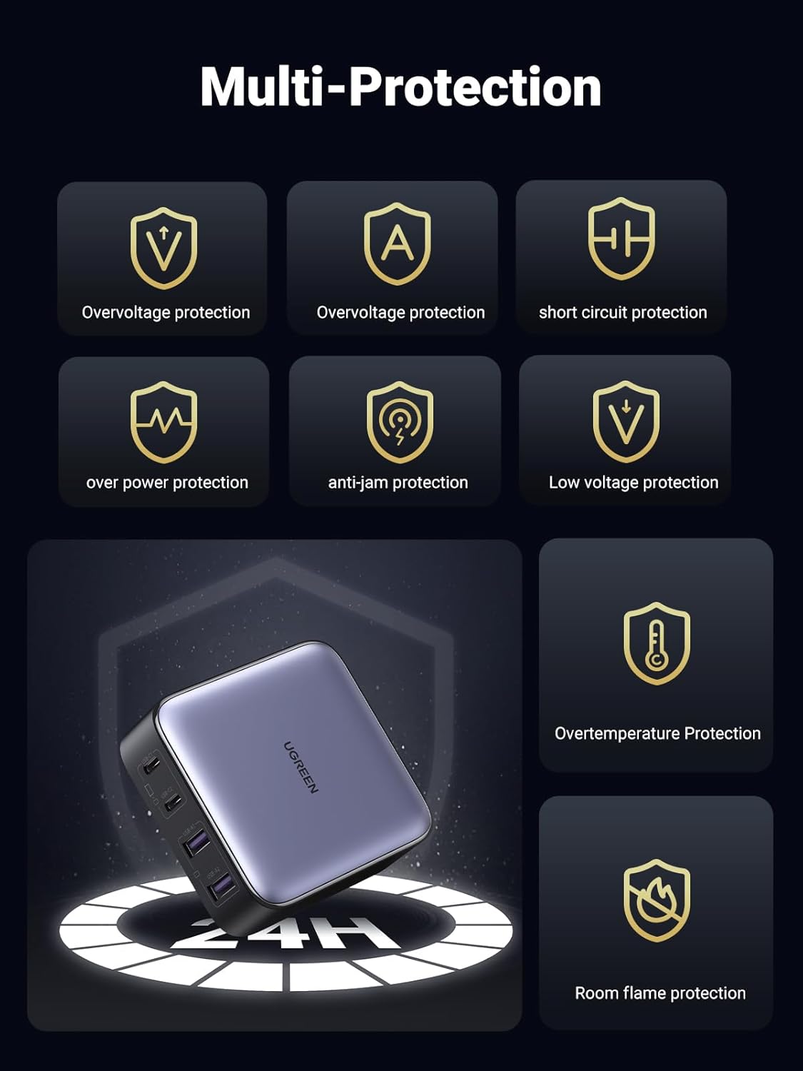 Multiple Protection Features: Equipped with safeguards against overheating, overcurrent, and overvoltage to ensure safe charging.