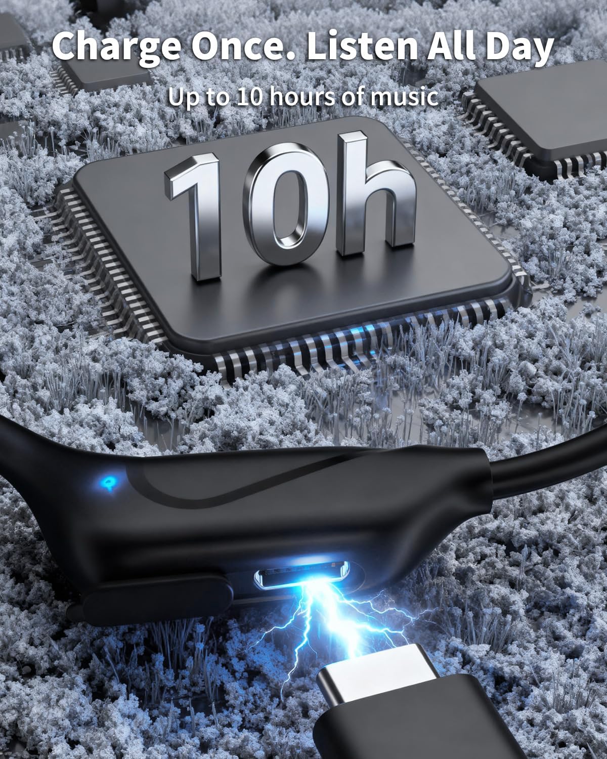 - Bone Conduction Stereo — Delivers clear stereo sound through bone conduction while leaving ears open for ambient awareness.