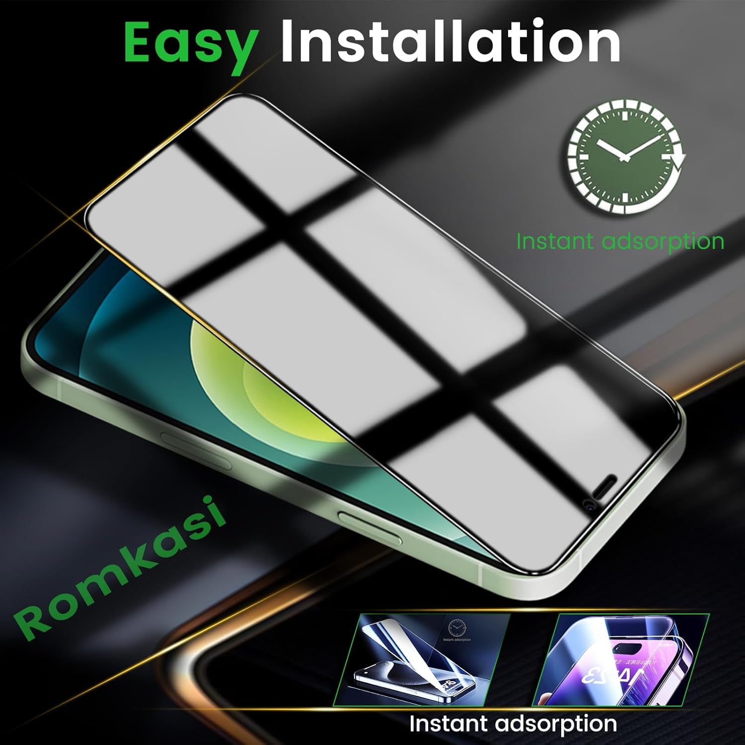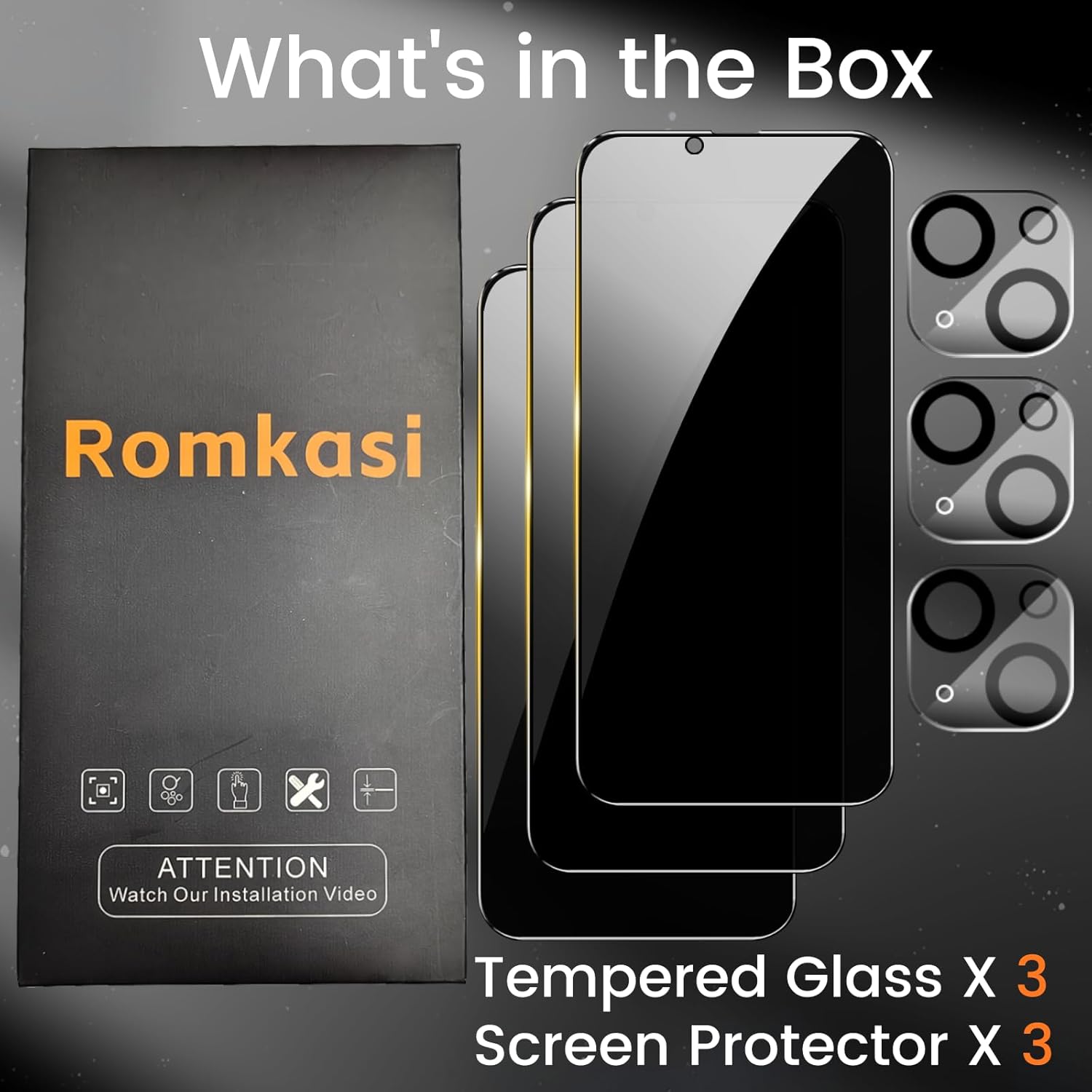 Meet Romkasi's iPhone 12 Privacy Screen Protector 6.1 Inch 3 Pack with Camera Lens Protectors. This set includes three privacy screen protectors plus three camera lens protectors, designed specifically for iPhone 12. It guards against scratches, dust, oil, and fingerprints while maintaining responsive touch and clarity. The privacy filter hides your screen from side angles, and the camera lens protectors preserve photo quality even in low light. Ideal for privacy-conscious users, commuters, travelers, and remote workers who want reliable protection in one convenient bundle.