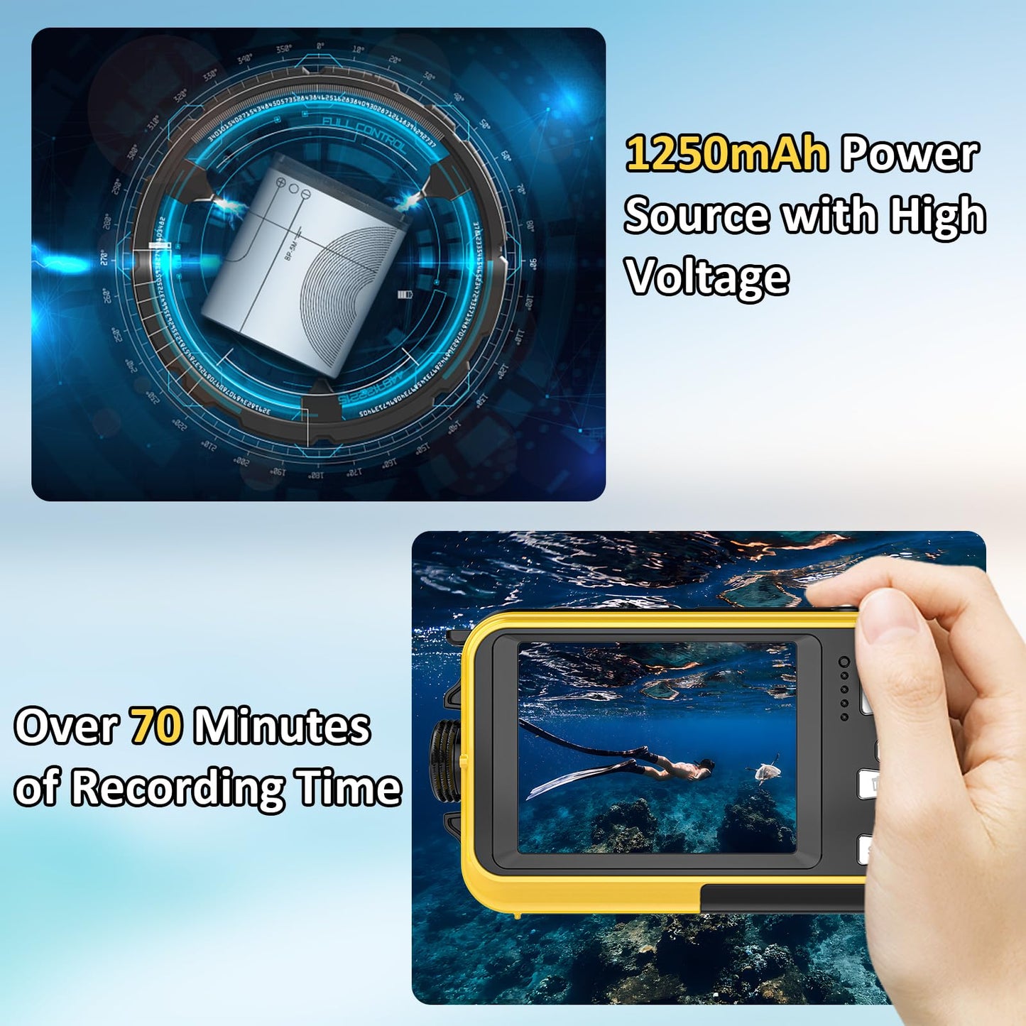 - Wide-Angle Lens: Capture more of the underwater scenery with a 170-degree field of view.