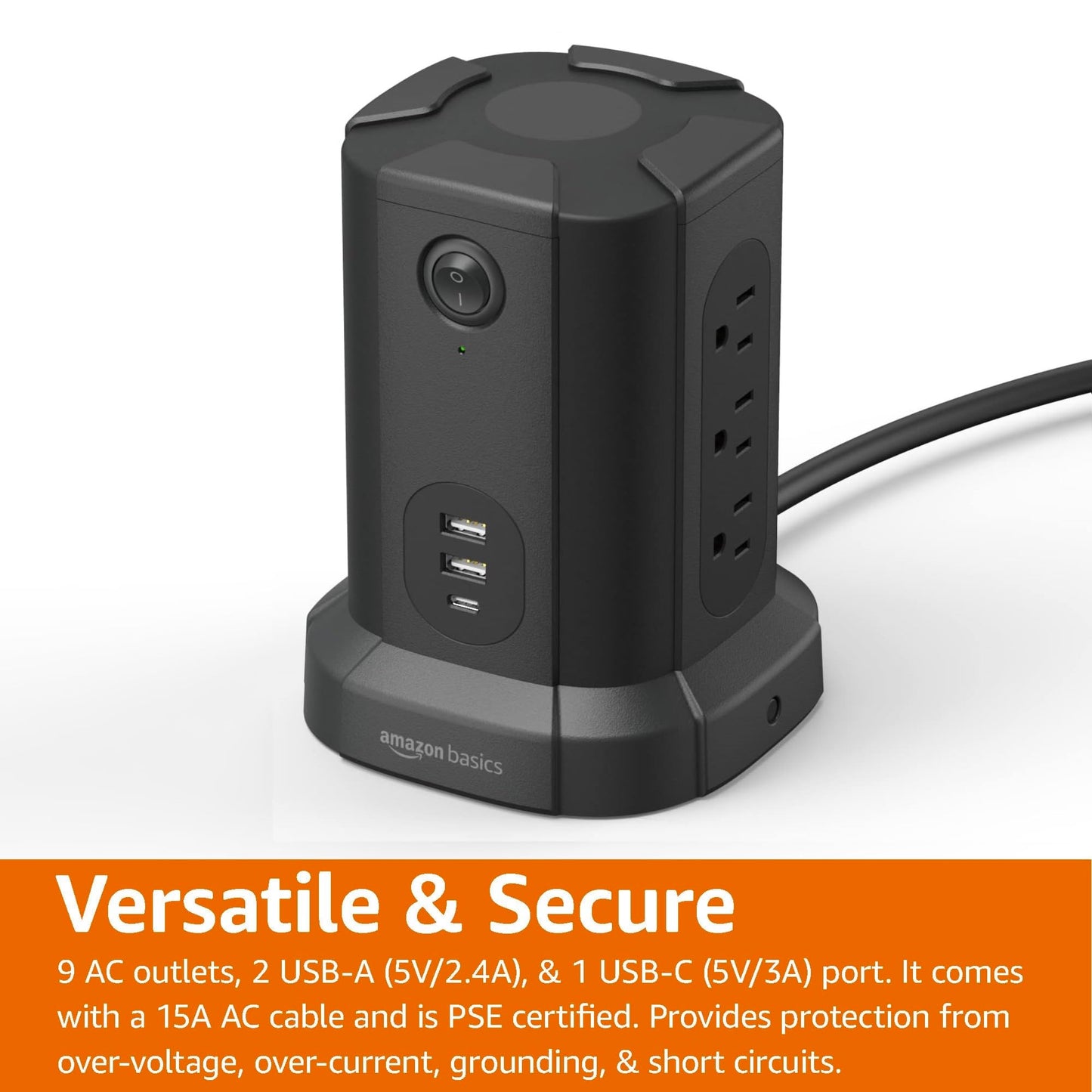 The Amazon Basics Rectangular Power Strip Tower is a compact, high-capacity power management solution designed for home offices, entertainment centers, and workstations. Built to charge up to 12 devices at once, it combines nine AC outlets with three integrated USB charging ports (2 USB-A and 1 USB-C) for flexible device support. With 1080J surge protection and multiple safety features, it reduces the risk of damage from spikes while keeping cables organized and accessible. Choose this tower when you need reliable, space-saving power distribution for multiple gadgets without sacrificing safety or convenience.