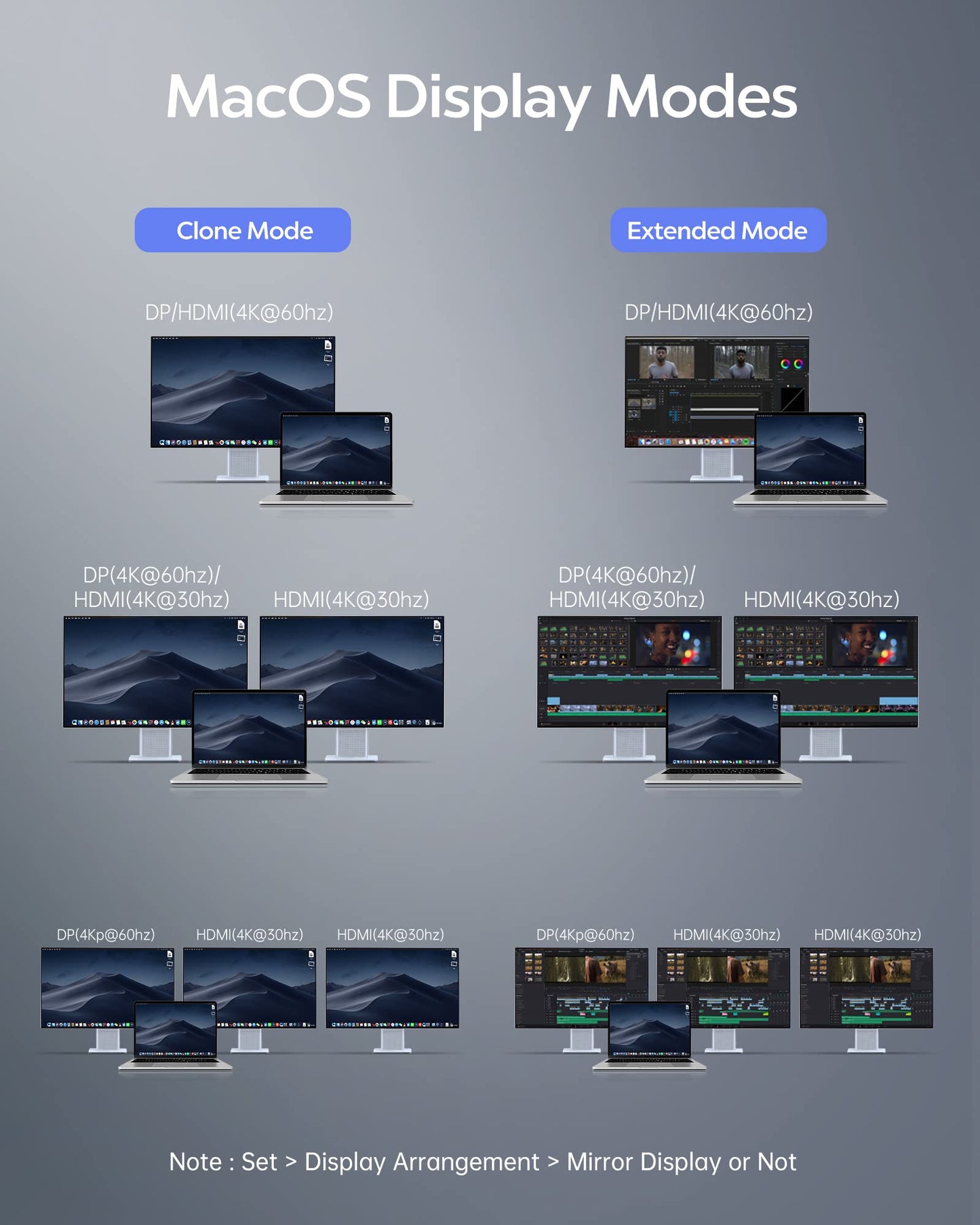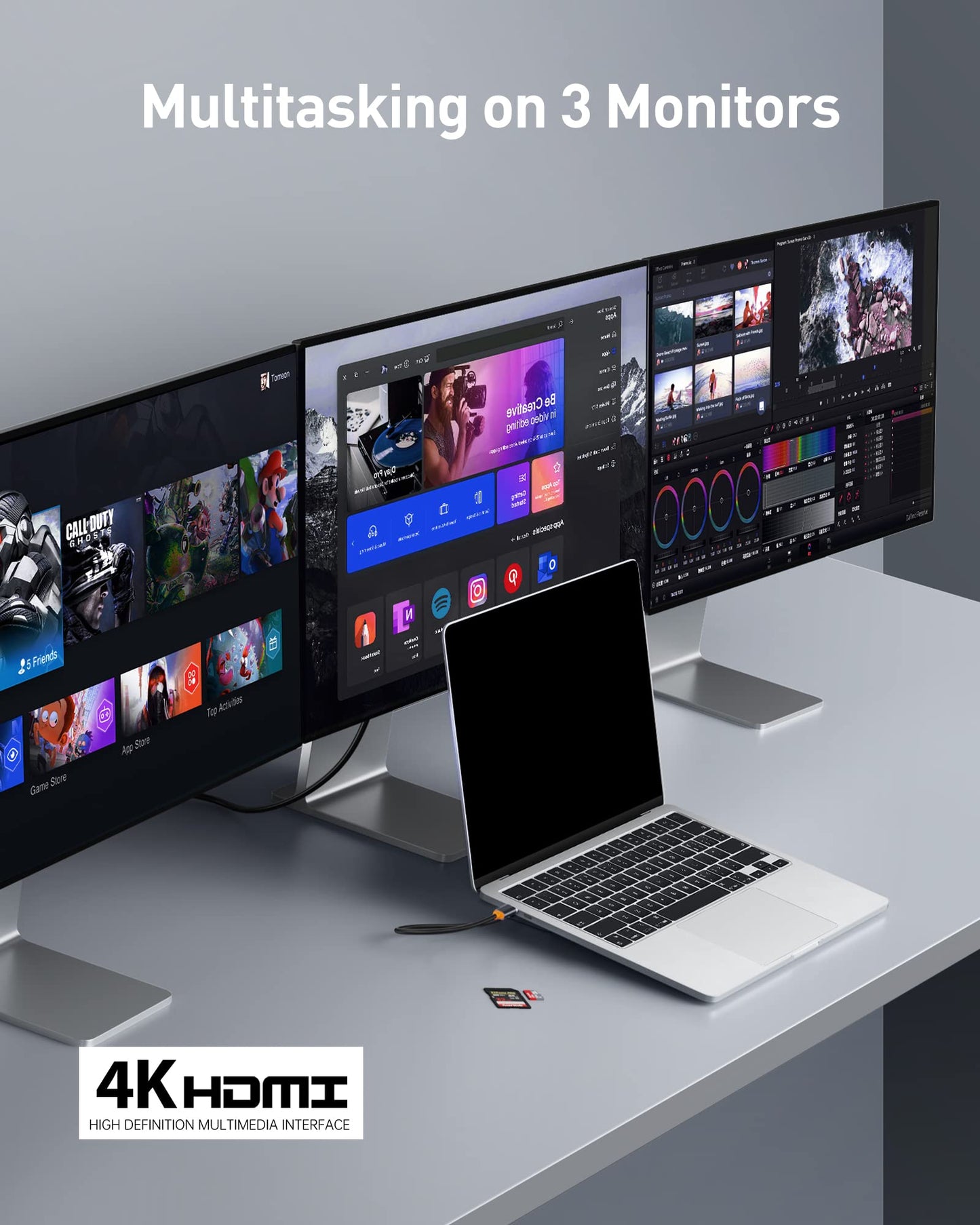 • Triple-display support — Connect up to three external monitors (combining HDMI and DP outputs) for extended desktop or mirrored setups to boost productivity.