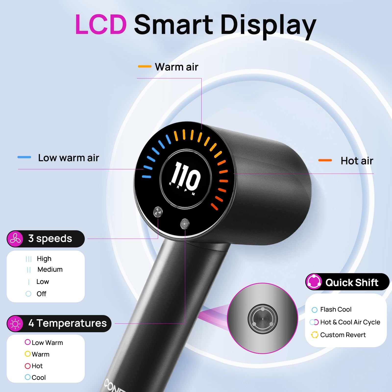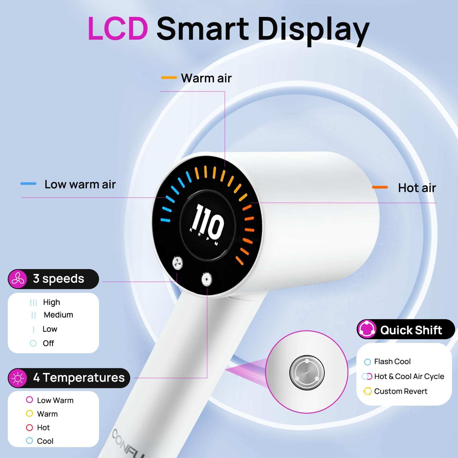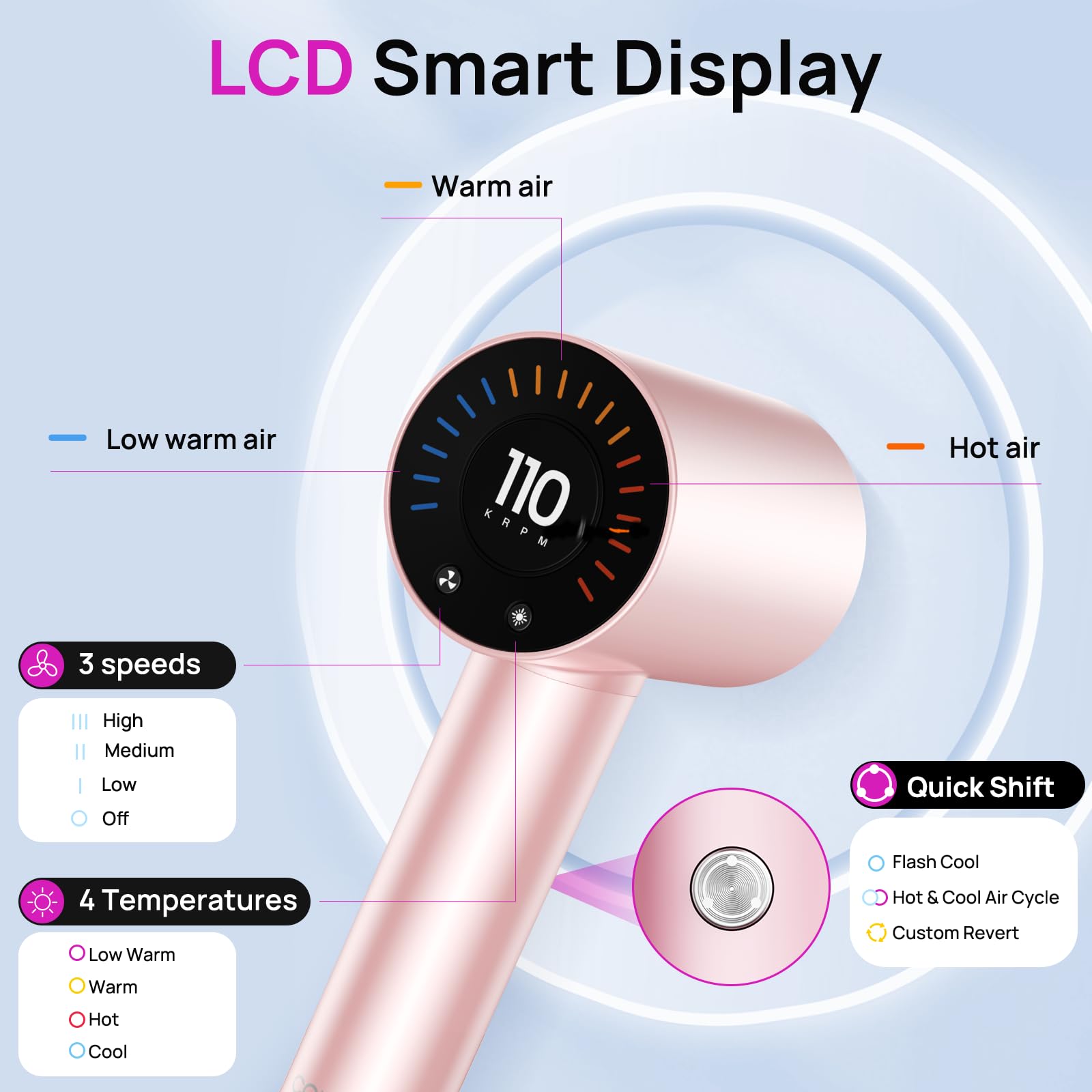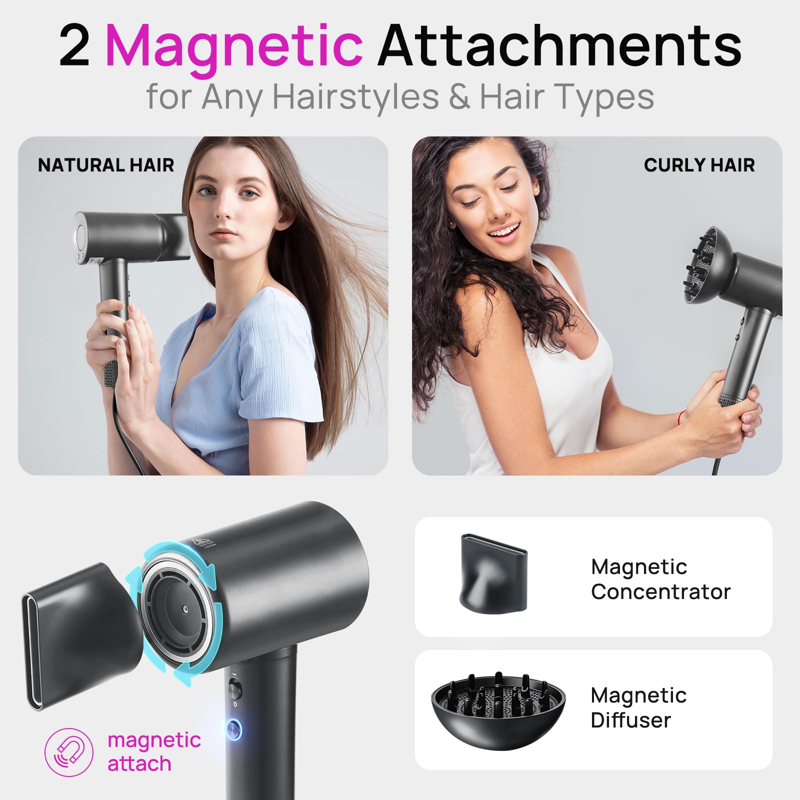 • Multiple Heat Settings: Featuring multiple heat and speed settings to customize your drying experience for different hair types.