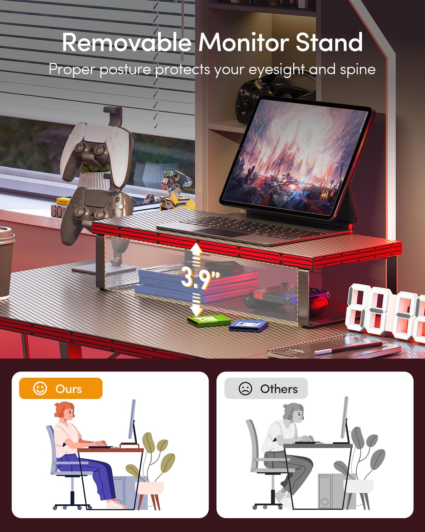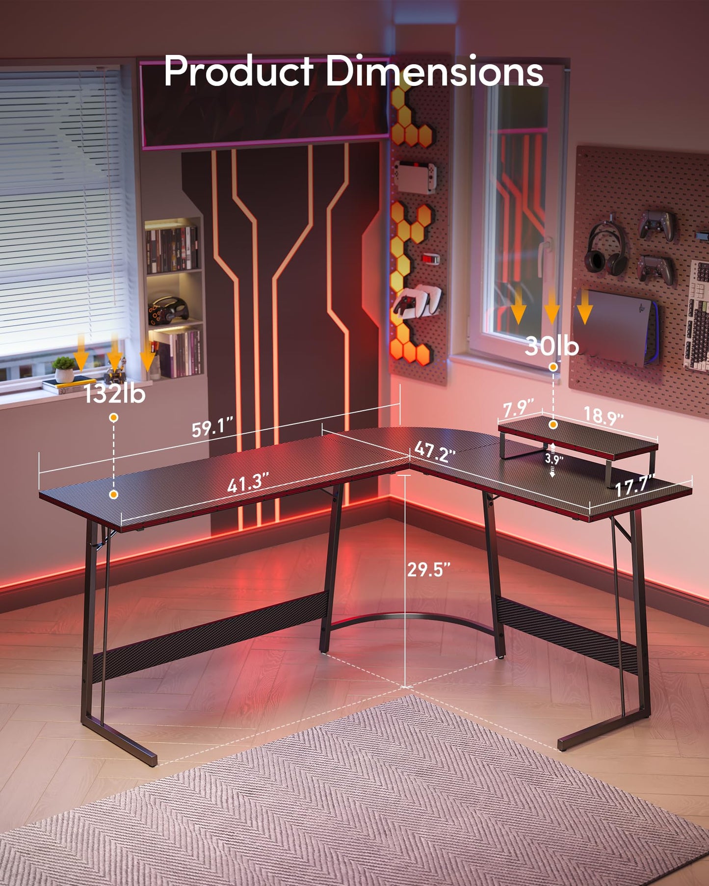 • Spacious Work Surface: The L-shaped design offers plenty of room for multiple monitors and accessories, making it perfect for gaming and multitasking.