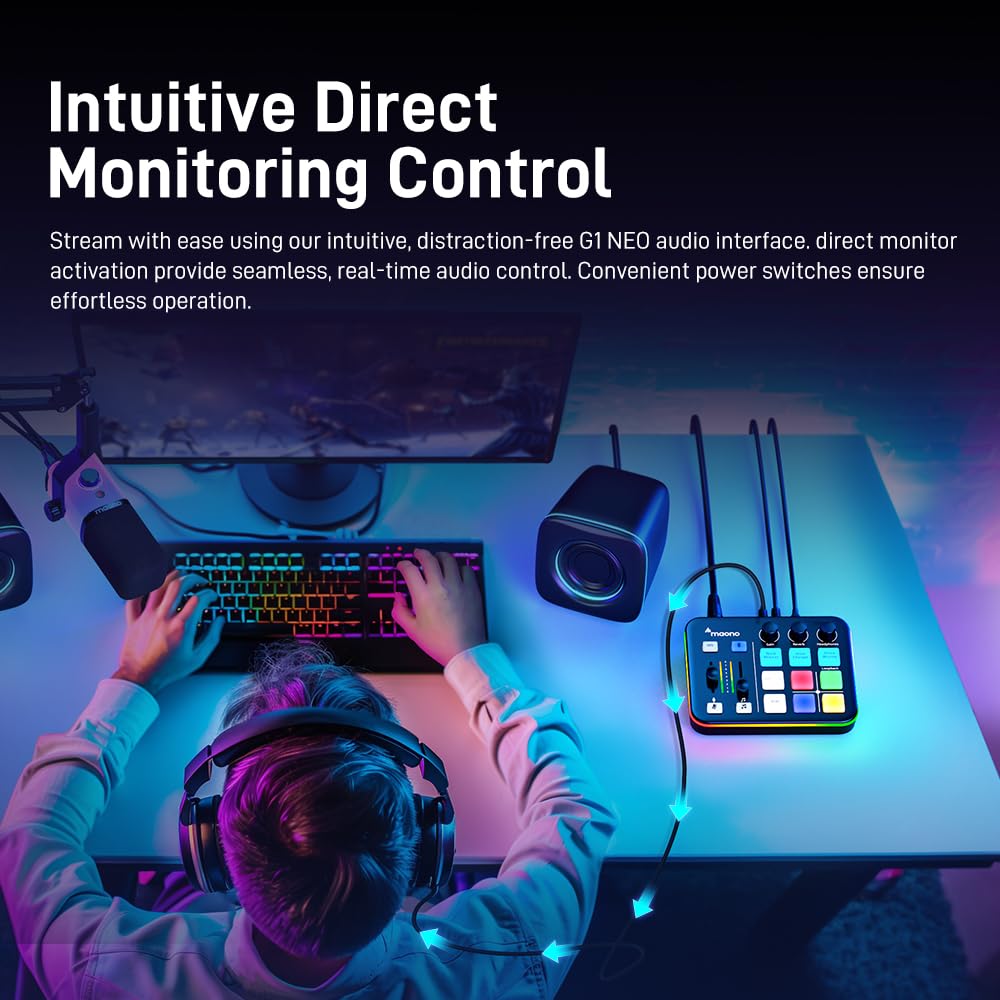 The MaonoCaster G1 NEO Gaming Audio Mixer with Pro Preamp RGB is a compact, streamer-focused audio mixer designed for gamers, podcasters, and content creators who want professional sound without complex setups. It combines a pro-grade preamp with 48V phantom power, one-click noise reduction, and customizable sound pads to deliver clear, broadcast-ready voice performance. Built-in RGB lighting and voice-changing effects add personality to live streams while simple controls keep you focused on gameplay. Ideal for aspiring streamers and small studios seeking an all-in-one mixer that balances performance, portability, and ease of use.