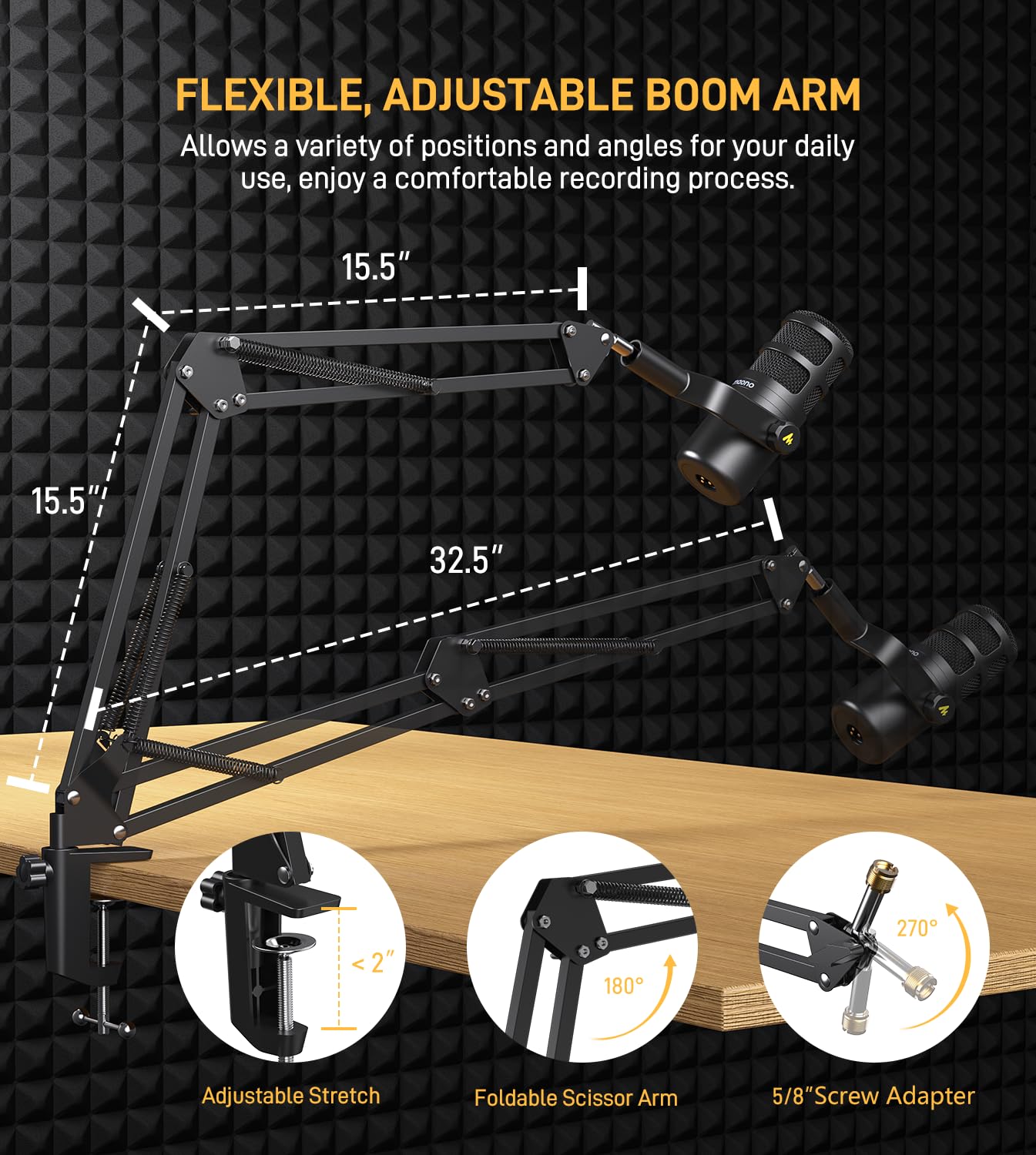 • Included accessories: Comes with desktop stand, rod extender, heavy base, and 6.56 ft XLR cable for an all-in-one start-up kit.