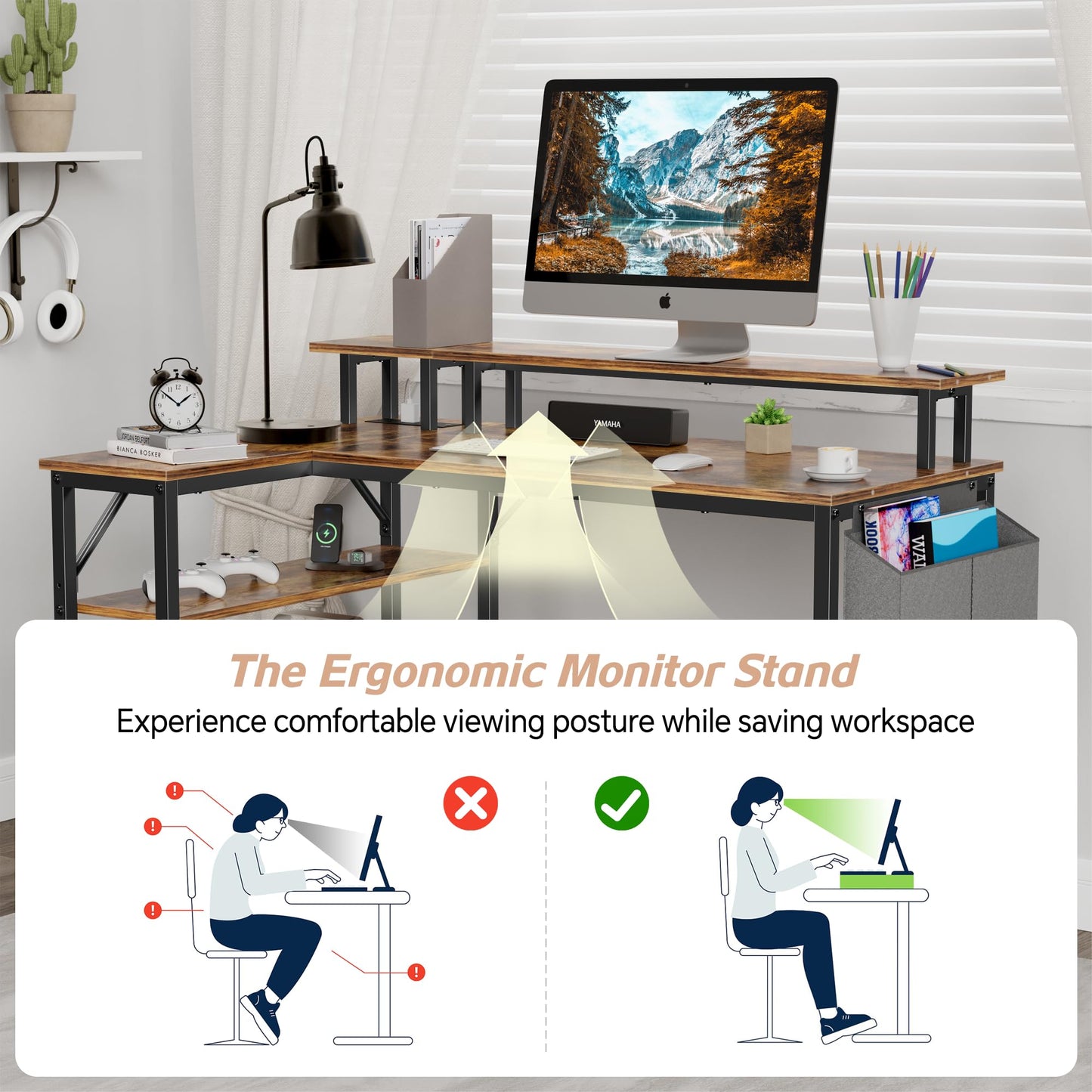 • Ample Workspace: The L-shaped design offers generous surface space, ideal for multitasking with multiple screens, books, and tools.