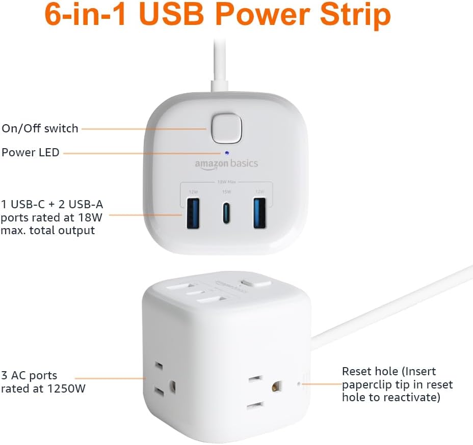 The Amazon Basics Power Strip Cube is a compact multi-outlet power hub designed to expand a single wall outlet into a versatile charging station. Ideal for home, office, and travel, it combines three grounded AC outlets with three high-efficiency USB charging ports so you can power laptops, lamps, phones, tablets and accessories at once. Its cube form and 5 ft extension cord keep outlets accessible while reducing clutter, making it a practical upgrade over standard wall outlets or single-port chargers. Choose this unit when you need reliable, space-saving power distribution for everyday tech essentials.